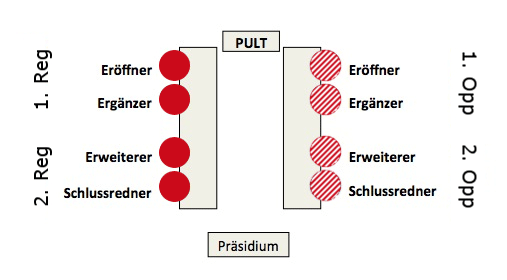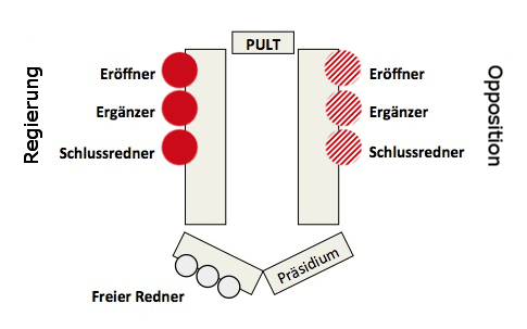 - Insgesamt vier Teams mit je zwei Rednern nehmen an der Debatte teil: zwei auf der Regierungsseite, zwei auf der Oppositionsseite.